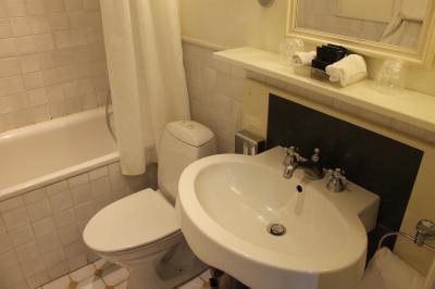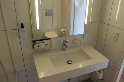 洗面台は少し小さく、化粧品などを置く場所が少ないです。バスタブにはシャワーカーテンの代わりに透明なガラスが設置されていたのですが、半分くらいの位置までしかなく、シャワーを浴びると水がバスタブの外に飛び散ってしまい、難儀しました。