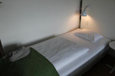 白をベースにアクセントでグリーンが使われている部屋には、シングルベッドが2つ、カラーボックスのような棚、窓際にソファーと机。クローゼットは無く、部屋の一角にハンガーが設置されていて、カーテンで隠せるようになっています。ミニバーはありませんでした。