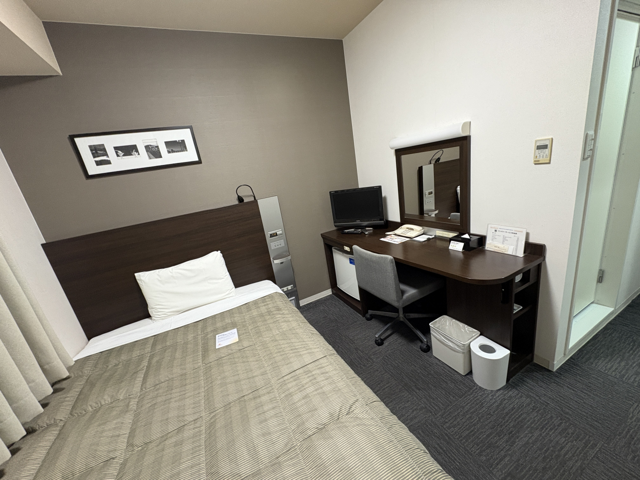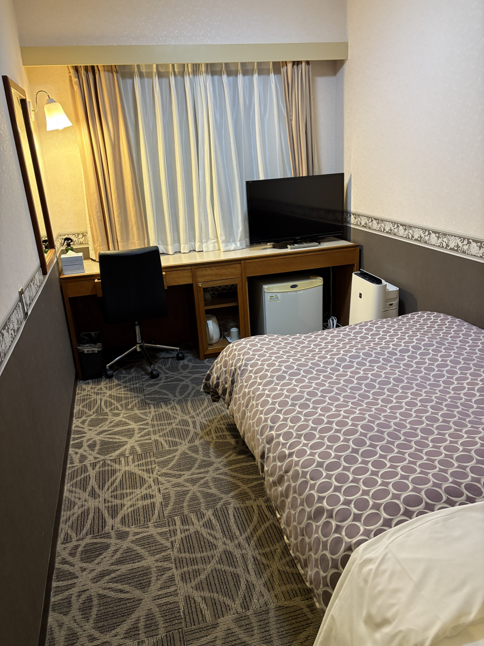 新千歳空港から朝1便の利用になり、前日JRの遅延等もあって念のため新千歳空港内のホテルに急遽泊まることにしました。なので料金はかなりお高目で、直近の予約だったので仕方ありませんが、部屋に入ってこの狭さでこのお値段かとちょっとがっかりでしたが、唯一お部屋の窓から飛行機や滑走路が見られたのはとっても嬉しかった。夜の空港もとっても素敵でした。札幌や千歳は最近ホテル代が高騰していて、何とかならないあかなあと思っています。
