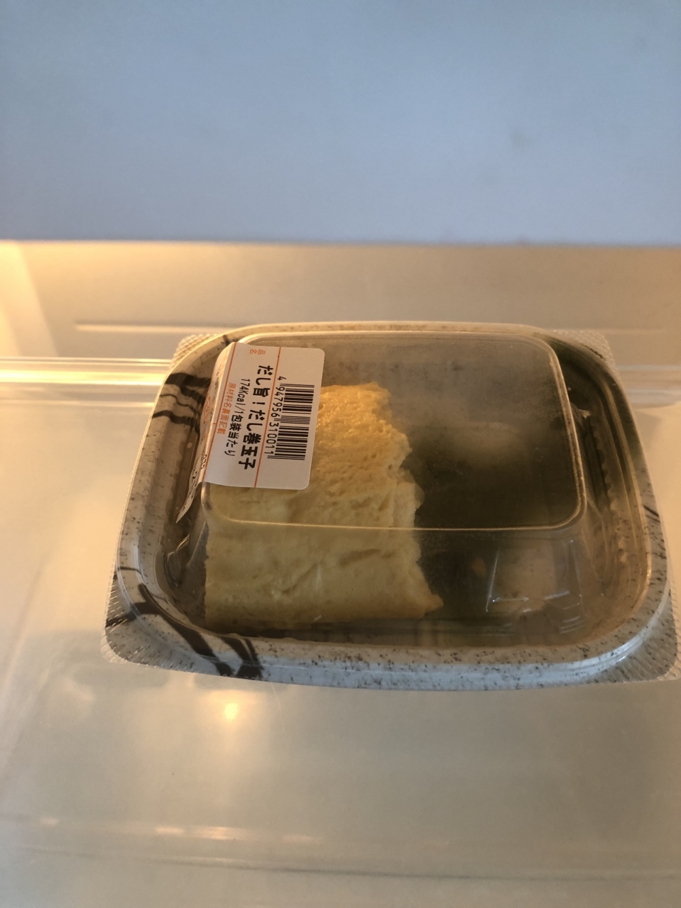 翌朝、水を飲もうと部屋の冷蔵庫を開けてみると、おそらく前の宿泊者の食べ残しの厚焼き卵が入っていました。