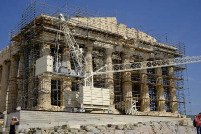 全て修復工事中です。クレーン車と足場がドドーンと視界を遮り、パルテノン神殿の外観を損なっています。平日というのに工事もなされておりませんでした。
