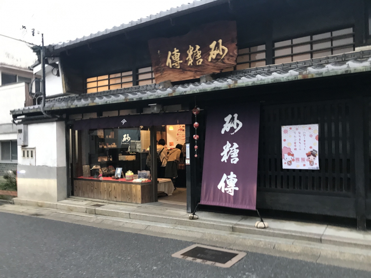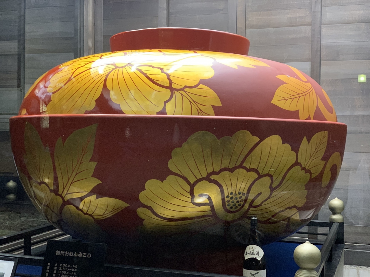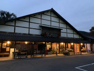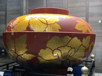 夕方うす暗い中で、建物横に大きな漆器がライトアップされていました。なにかと思ったらおわん神輿でした。お店をのぞいたら、地元の野菜や工芸品などが売っていました。名産の里いもとミカンを買いました。キャッシュレス還元していたのがよかったです。