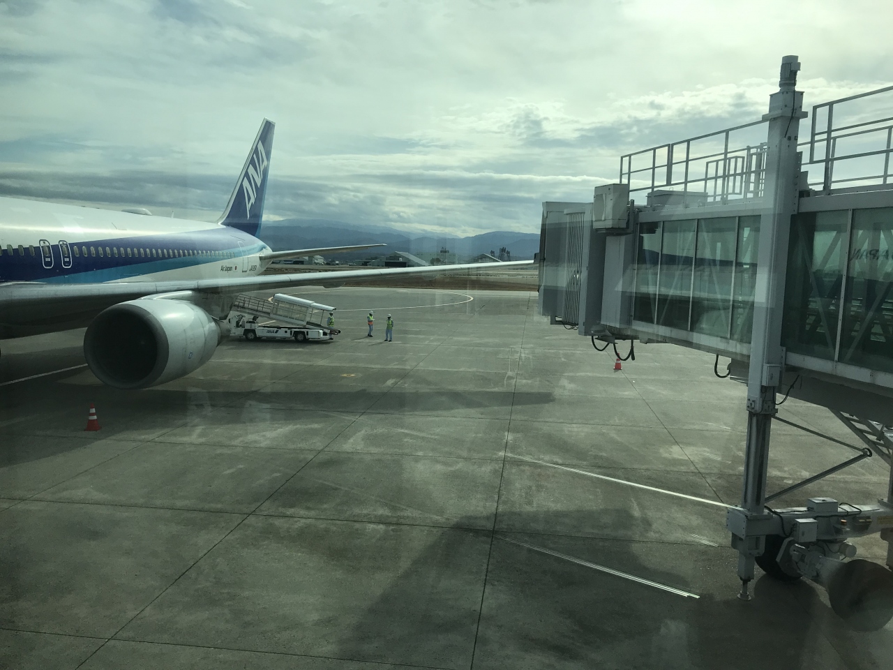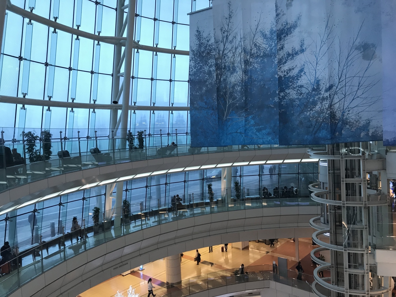 ANAの飛行機で着陸しました。雨の日だったので、せっかくのガラス張りの壁から見える空も雨空でどんよりした雰囲気でした。丁度お昼時だったので、4階部分のレストランはどこも行列。3階のフードコートを利用しました。空港は割高感があります。