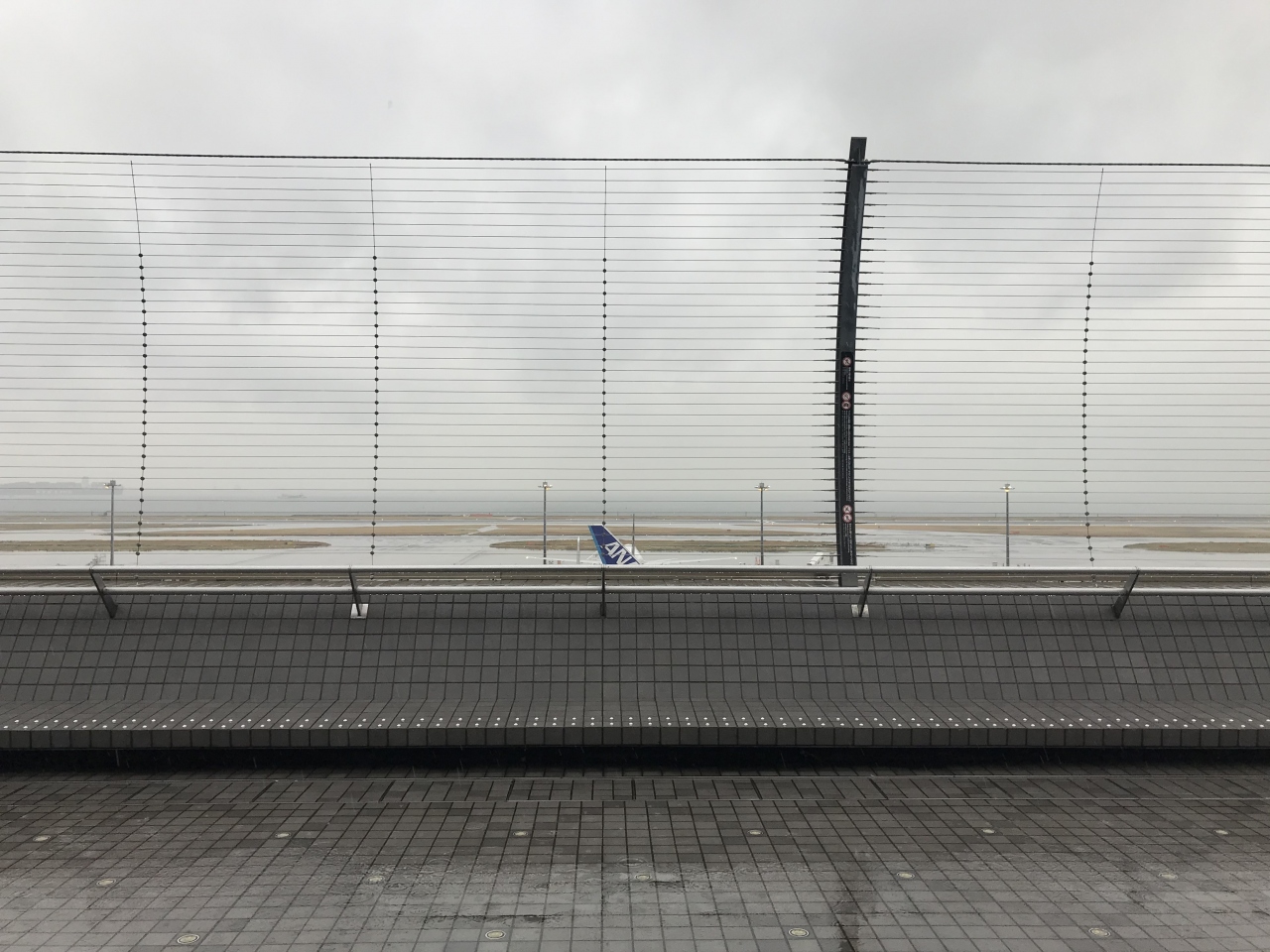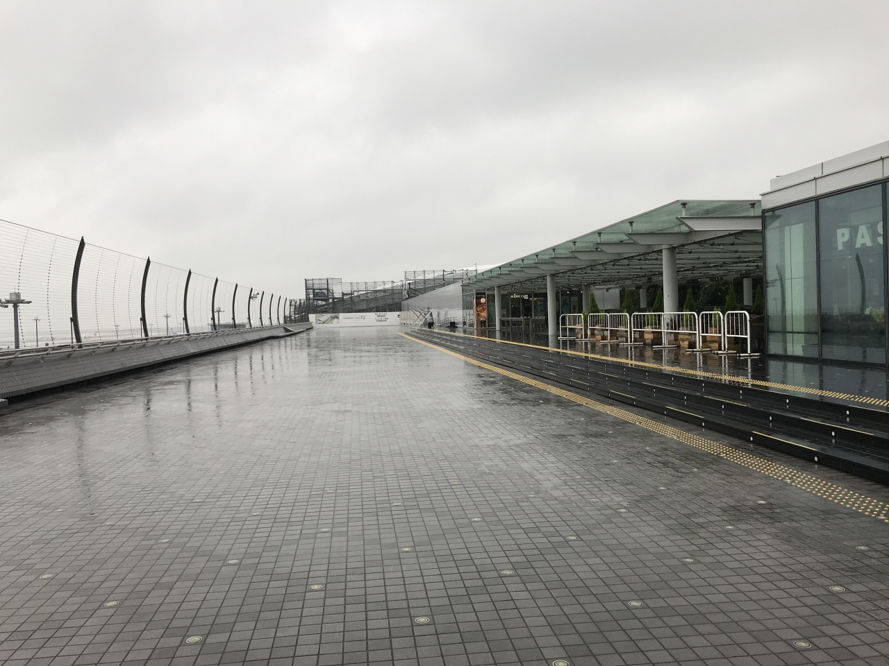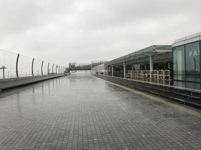 雨の日だったので、展望台出入り口の庇の部分まで出ました。外に出ている人は皆無でした。どんよりとした雨空で、出入り口からでは飛行機もよく見えず、すぐに中に入りました。展望台に面してガラス張りになっているので、中からでも飛行機は見えました。