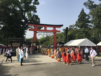 2018年、初めて葵祭を見に来ました。さすが衣裳が素晴らしいですね。他の地域の時代祭りとか見たことある人ならわかると思うけど、地方の時代祭の衣裳はペラペラで見るからにコスプレな感じのが多いけど、葵祭は高級感がある衣裳ですね。行列は音楽などなく黙々と行進していくんですね。厳かですが、みんな暑そうだった。ある意味現代の格差を感じるお祭りではあるんですが。