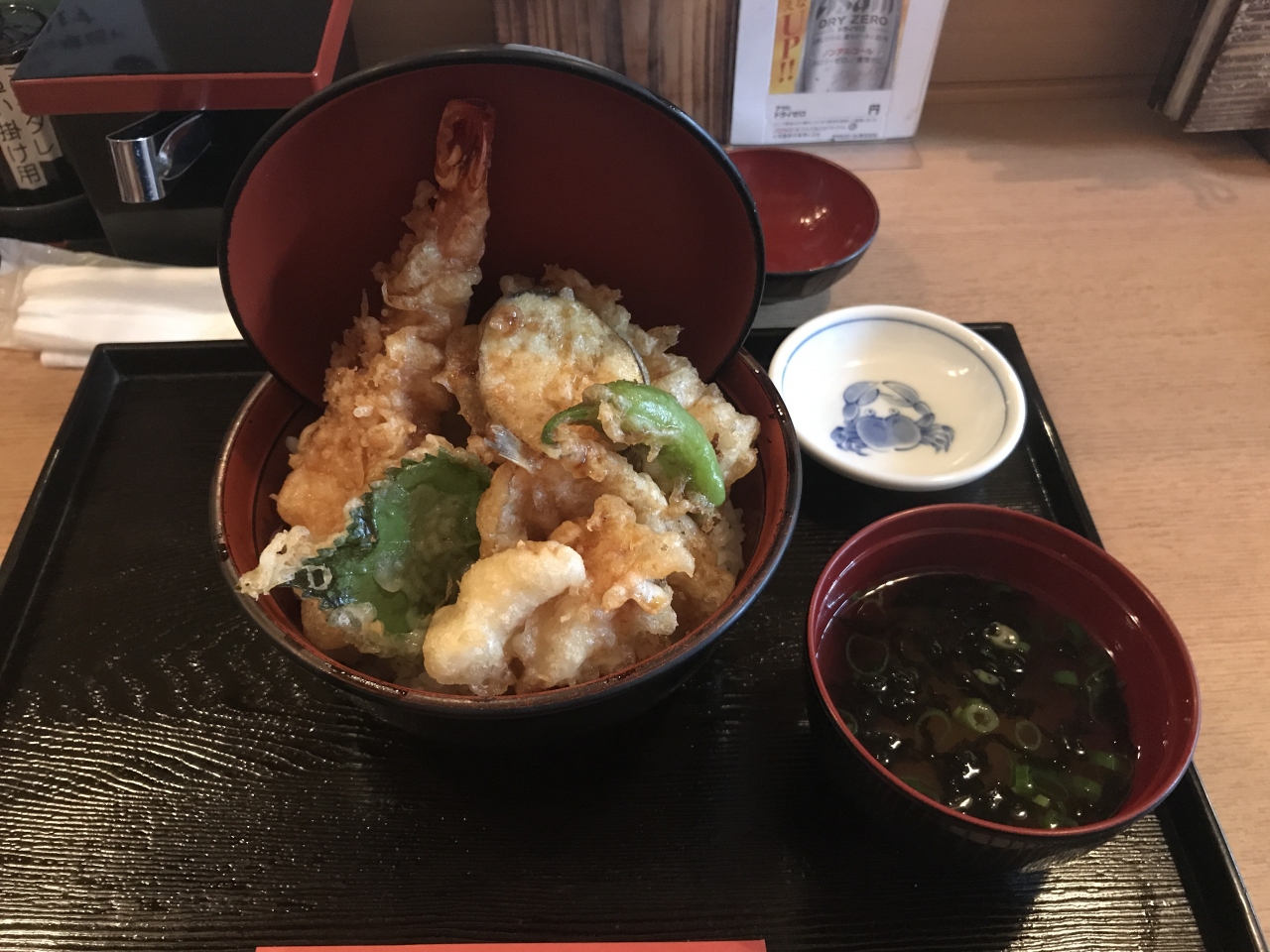 平日のランチに訪問。土砂降りの日にも関わらず、お店は混雑していて40分位待ちました。店内は狭くカウンター席のみで、複数人で訪問するグループ(地元の若者かな)が多いようで、かなり回転率は悪かったです。入口に入って左手側に待ち番号を発券する機械があるので、真っ先にそれを取った方が良いです。天丼を頼みましたが、普通に美味しかったです。たれを自分で調節できるのが良いですね。