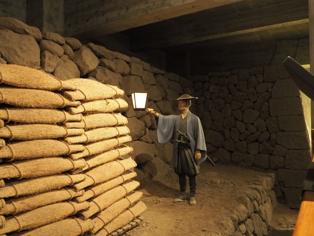 南走長屋の中は、とても綺麗で再建したばかりということがわかる。室内には銃を構えている実物大兵士の模型や、刀と銃の重さを半分にしたレプリカなどがあって、戦闘体制の場ということがヒシヒシと伝わってくる。テキストの展示がほとんどなかったので、もしかしたらこれから増やしていくのかもしれない。