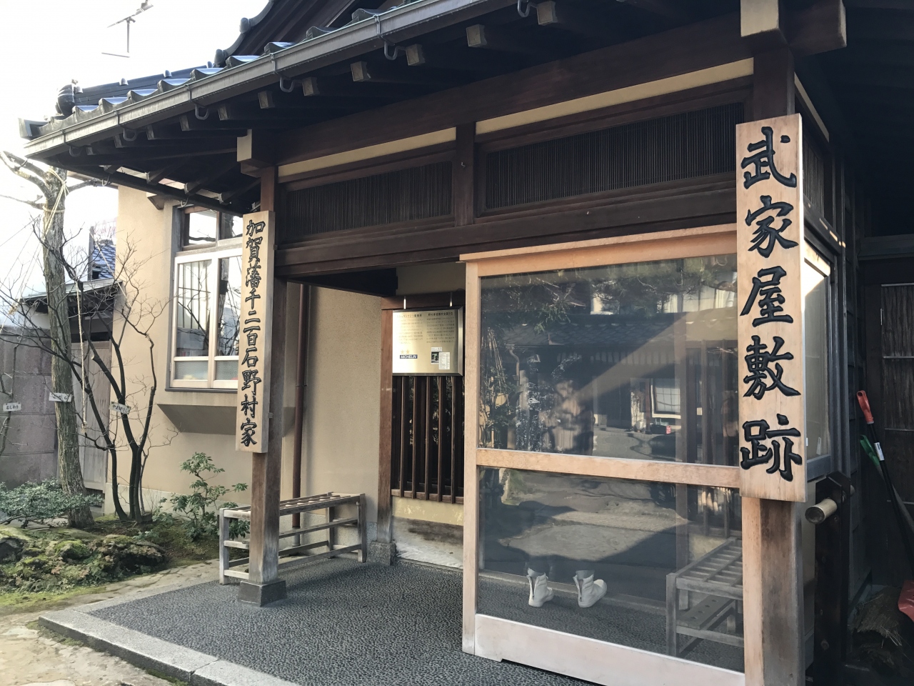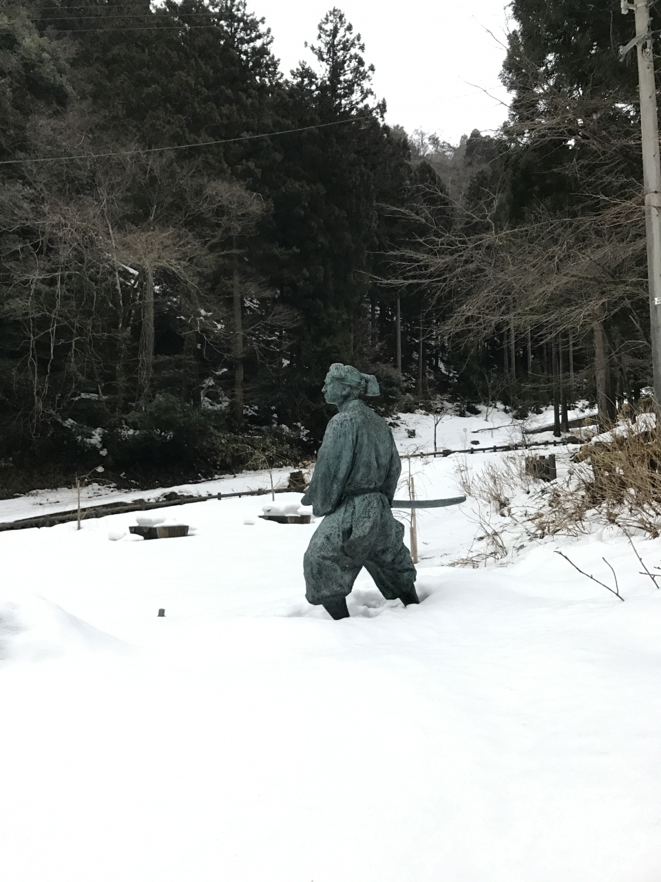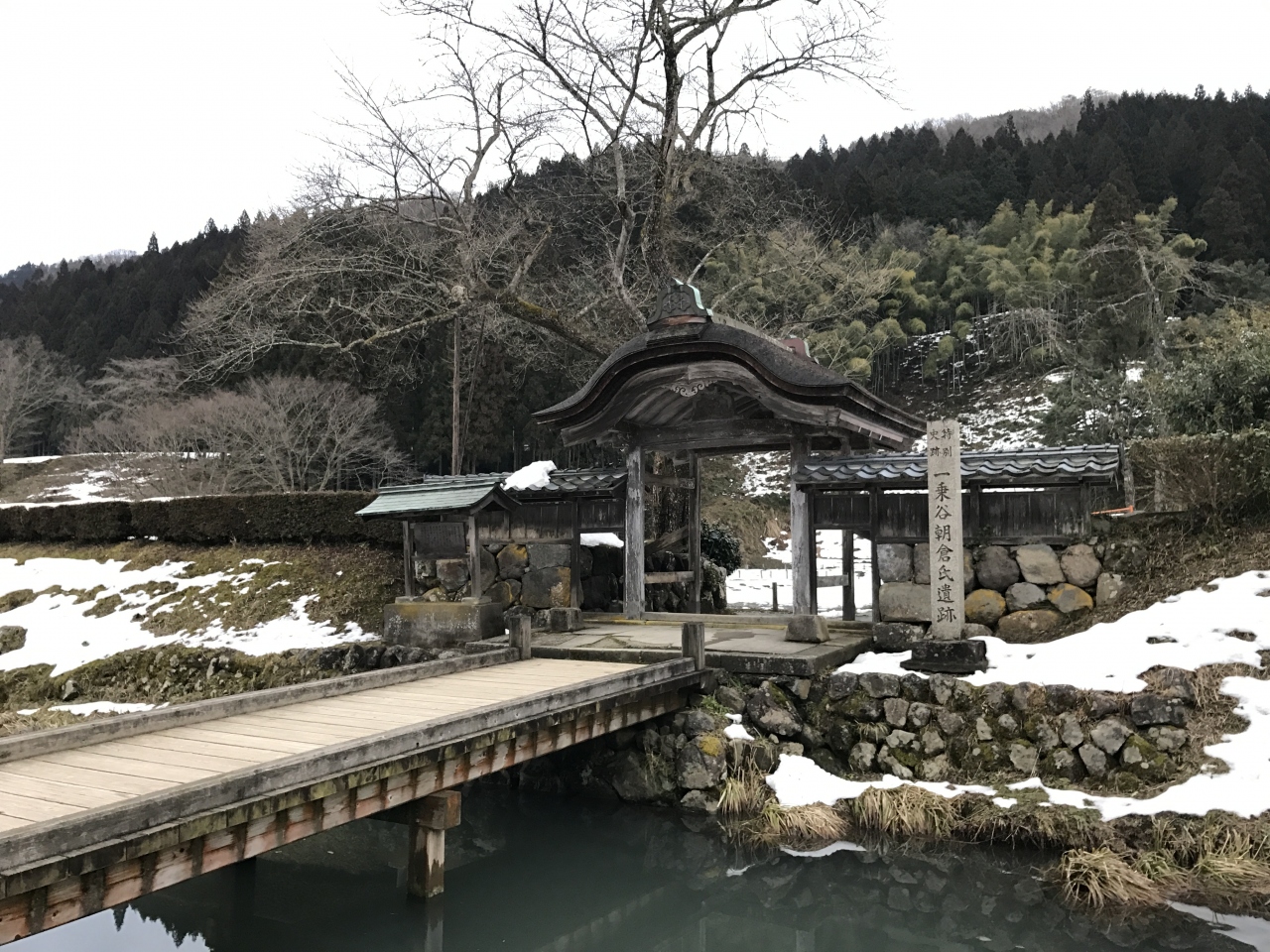 2月終わりの訪問。少しだけ雪が積もっていました。朝倉氏遺跡といっても、門しか残っていませんが。この門も復元されたもので、江戸時代くらいの門をどこかから移築したものという話を聞いたことがあります。あたり一帯は歩けるようになっているみたいですが、寒すぎて門を写真におさめて帰りました。