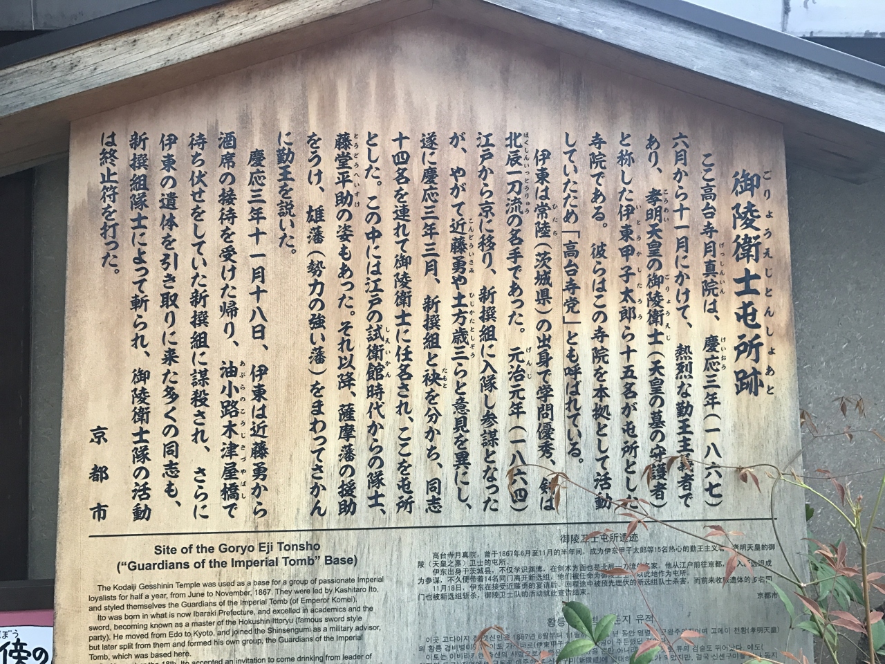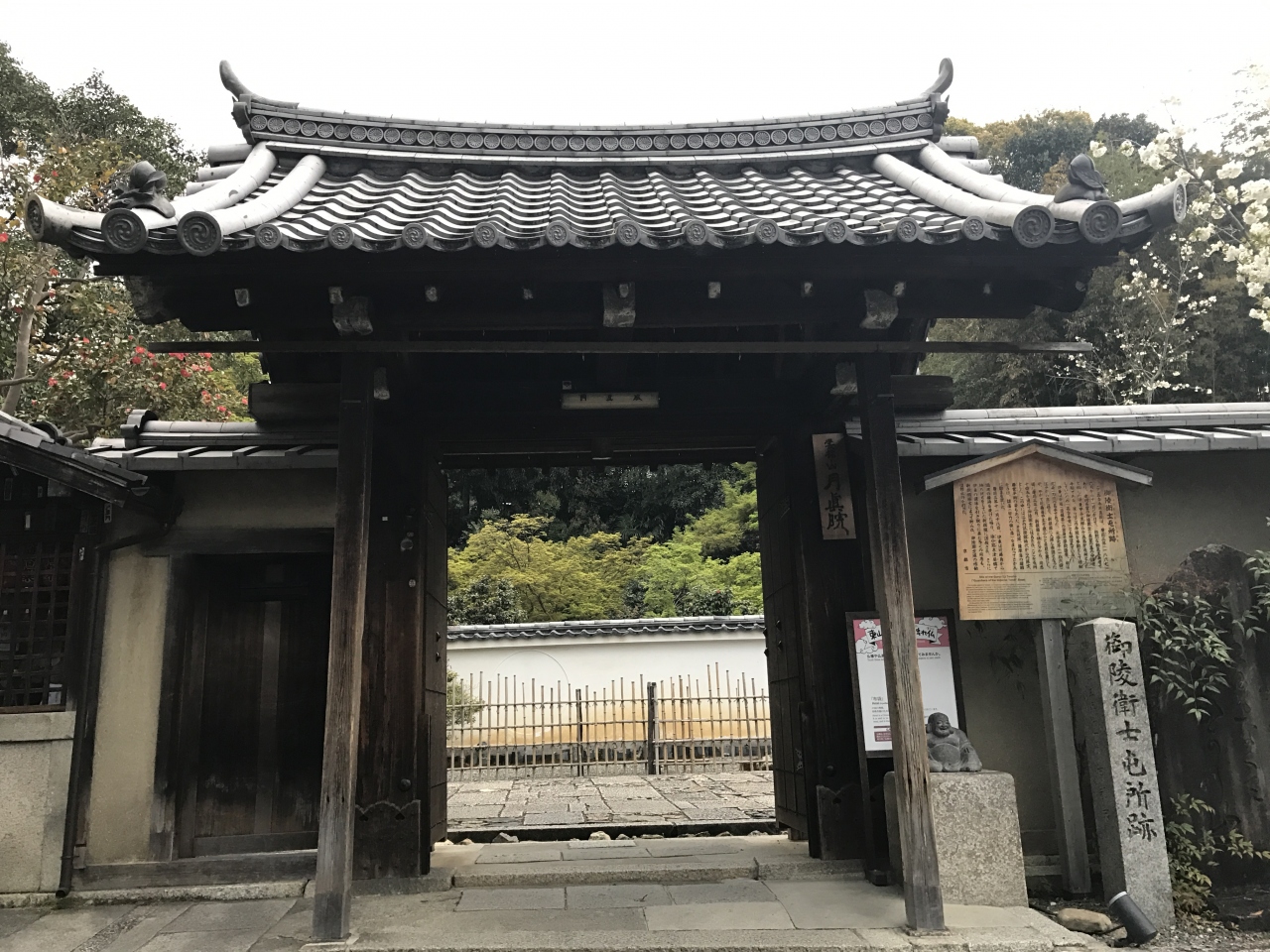 ねねの道にあるお寺で、門の前に新撰組関連の石碑と解説板が置いてあります。御陵衛士屯所跡という石碑が門の前にあったので、満足してしまいましたが、門の中も自由に入れることを後で知りました。今度門の中にも入ってみたいです。私のように門の前の石碑で満足してしまう人は意外と多いのではないかと思います。