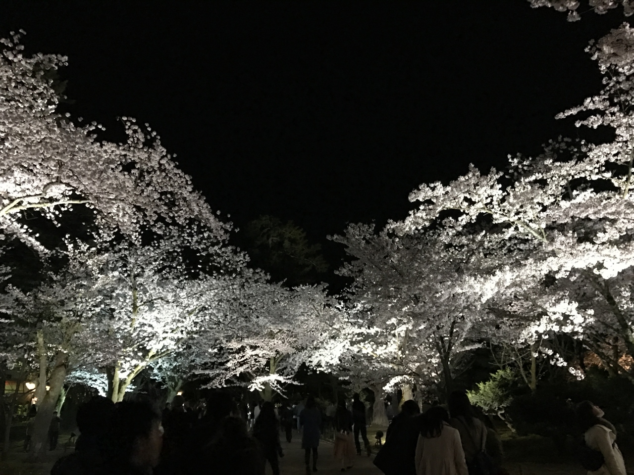 桜の時期の夜間ライトアップ。無料で開放してくれています。すごい人ですが、ライトアップされていても、意外と暗い。足元がかなり暗いので注意です。桜は沢山咲いているので、しっとりした花見が体験できました。思ったよりはライトが少ないなという感じです。有料にしてもう少しライトアップしても良いかと思う。