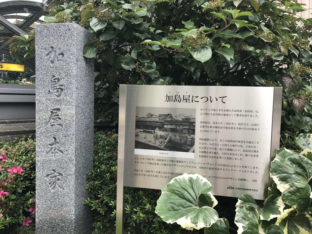 大同生命本社ビルの麓に石碑があります。NHKの連ドラ「朝がきた」の広岡浅子が嫁いだお家の鹿島屋について簡単に解説されています。大同生命のビルの中に鹿島屋ゆかりの品を展示していたら面白いのに、そういったものはないみたいです。ちょっと物足りないですね。