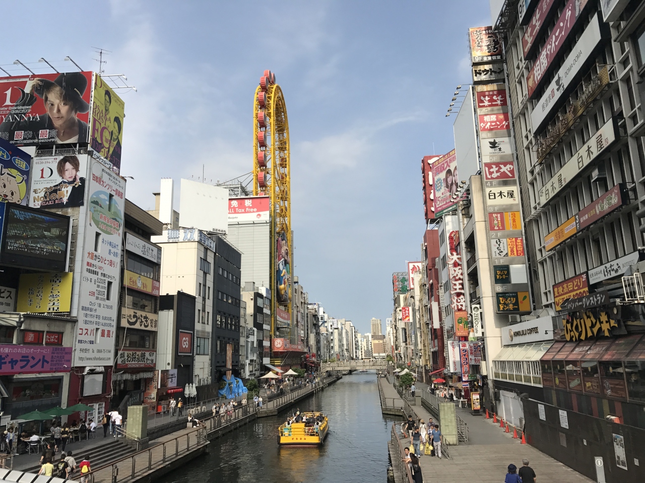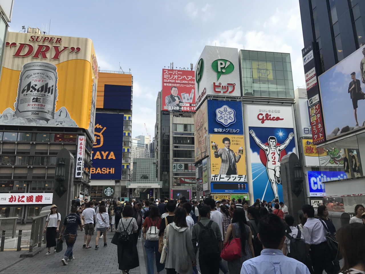 道頓堀の街並みは広告看板の大きさが一番特徴的だと思います。連なるビル群にこれでもかというぐらいの大きな広告看板が出稿されていて、道頓堀の景観を作り出しています。ただ、いつ来てもものすごい人ごみで、このあたりで買い物、飲食などはしたことがないです。