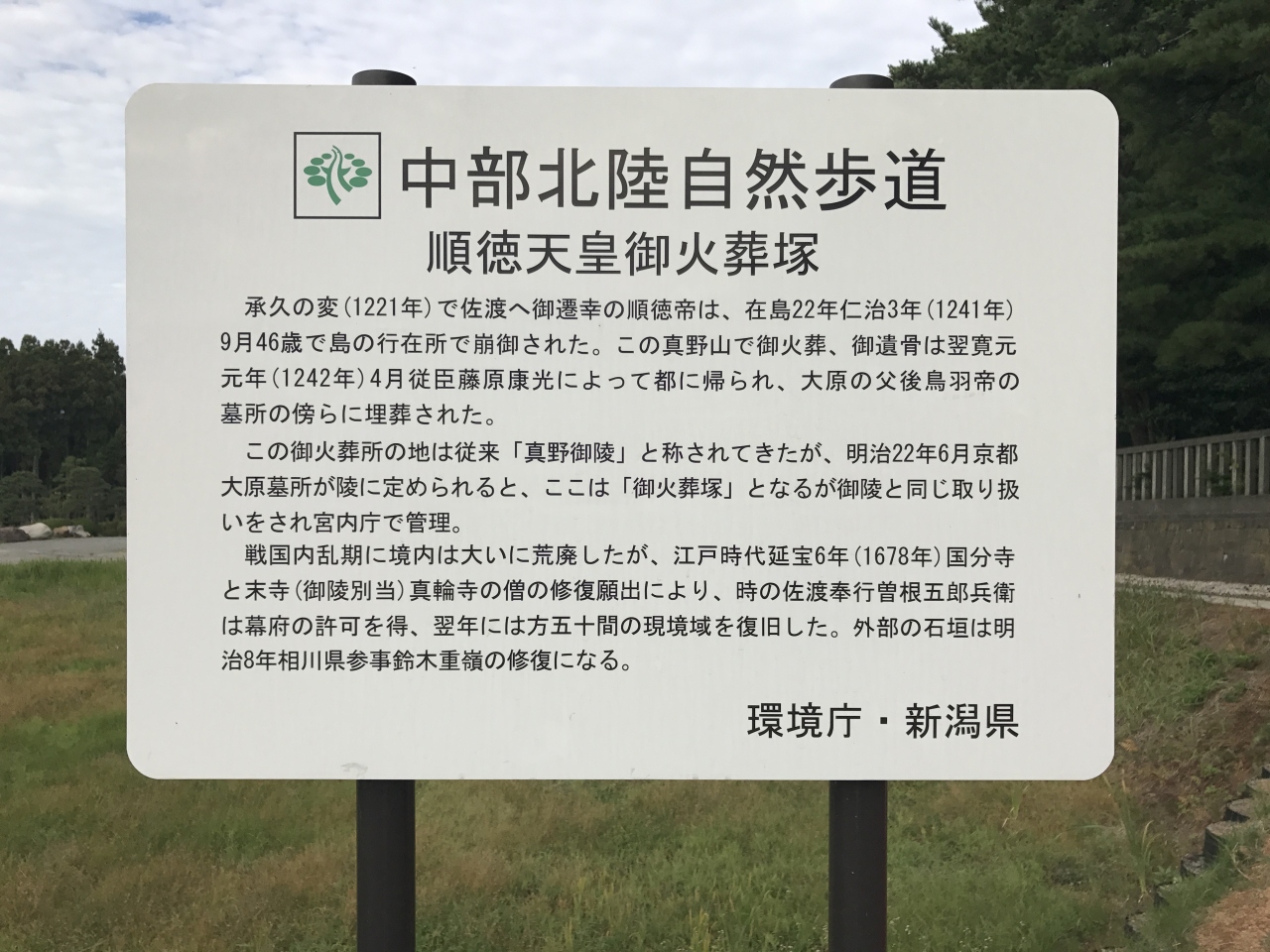 真野御陵の入口付近にある順徳上皇火葬塚は、くさっぱらの敷地に解説版が掲げられている以外は特に何もありません。