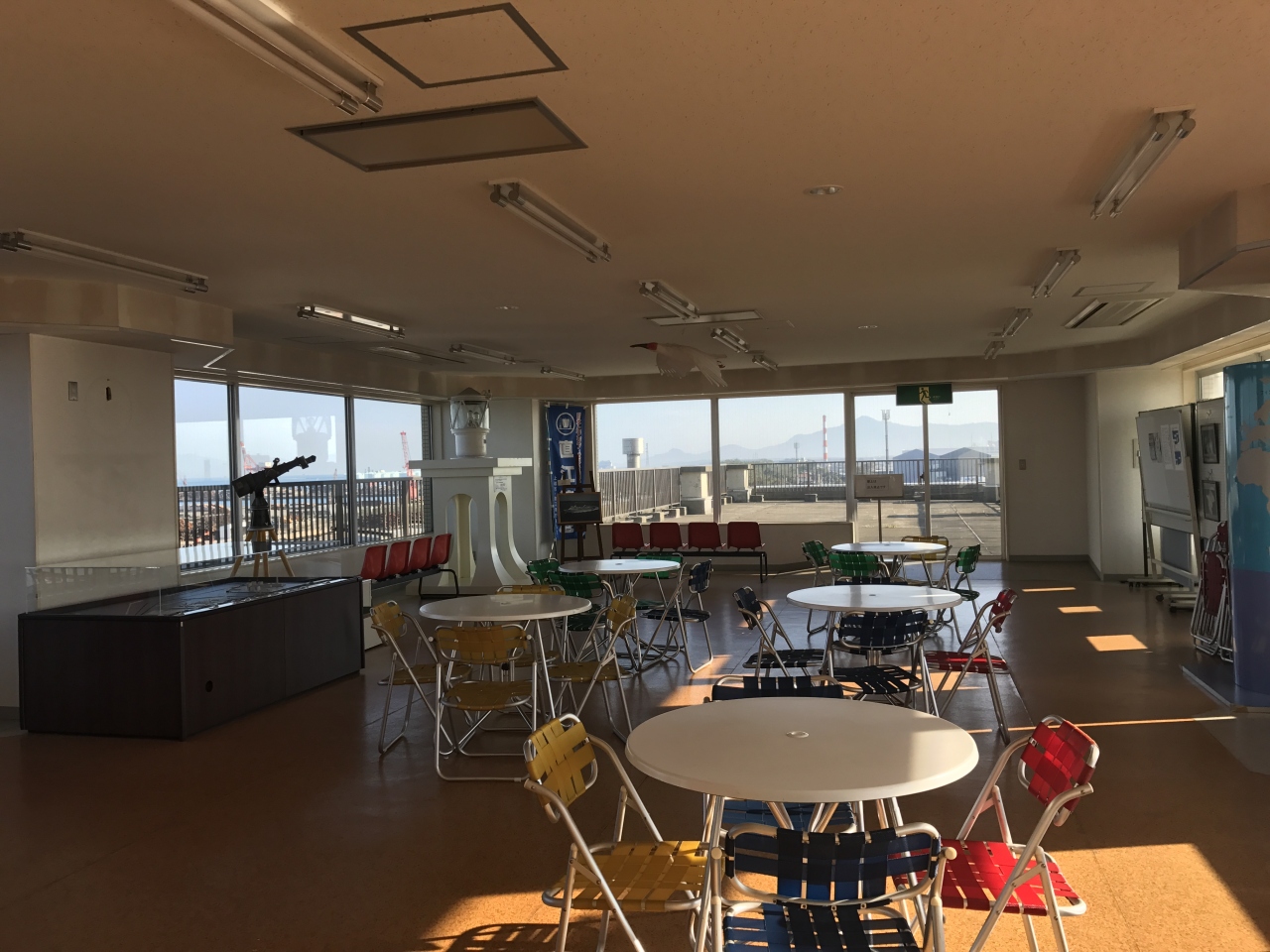 入口はいって左手側にそば・定食などの軽食屋さんがありました。安くて普通においしそうだったので食べようか迷いましたが、今回はやめ。隣の小さな売店を見て展望台スペースに行きました。直江津港は結構古い建物です。こじんまりしていても、暇つぶしスペースがちらほらあって良かった。