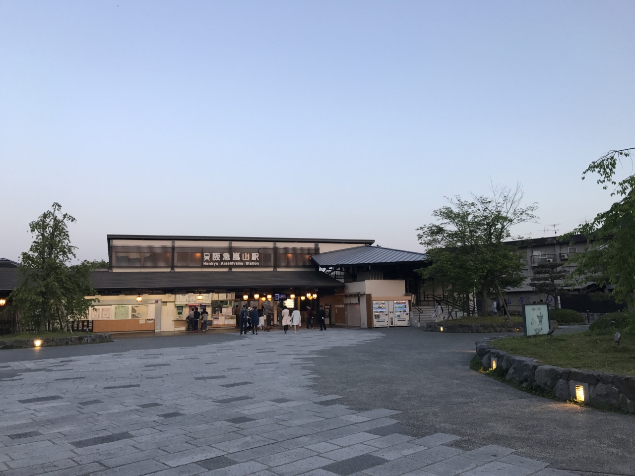 周辺のお店がほとんど閉まっていたのに、小腹が空いて、嵐山駅付近のコンビニに来たついで嵐山駅も見てきました。こじんまりしてますが、小ぎれいな駅です。自動改札の上にズラっとならんだ和風のライトが風情があります。今度はローカル線に乗ってきてみたいです。