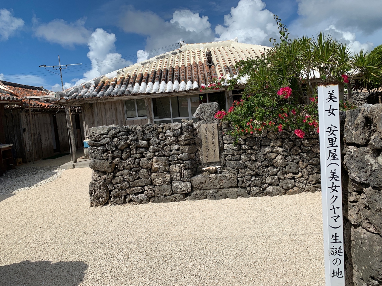 絶世の美女のクヤマが役人に結婚を求められても、どうせ苦労するなら好いた人と言って断った。とかそういった感じの話でした。クヤマがいつの時代の人か知りませんが、他の民家と比べてクヤマ生誕地の民家は屋根の色が白い。石垣の上には赤い花が咲いていて、なんか美人が出てきそうです。- 旅行時期