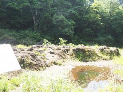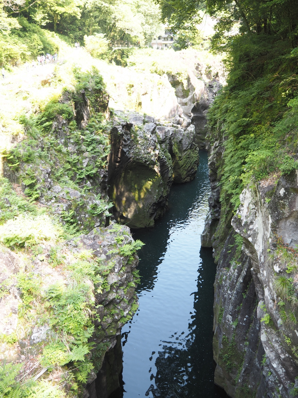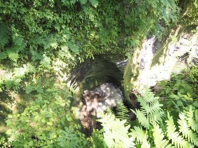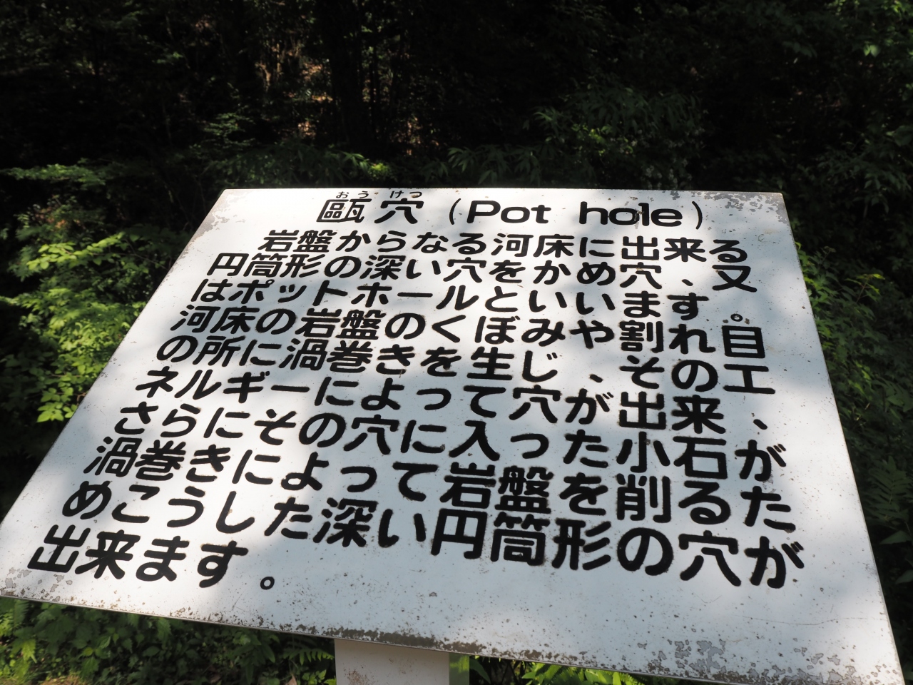 自然が作りだした円形の穴が甌穴と呼ばれていました。甌穴の底には小石が溜まっていました。「甌穴の中に渦巻が生じ」と解説にはあるので、甌穴の中で竜巻が起こるのでしょうかね。小石が竜巻によって岩盤を削るために、深い円筒形の穴ができるらしい。甌穴に竜巻が起こっているのを見てみたい気もしますが、危険な気もします。