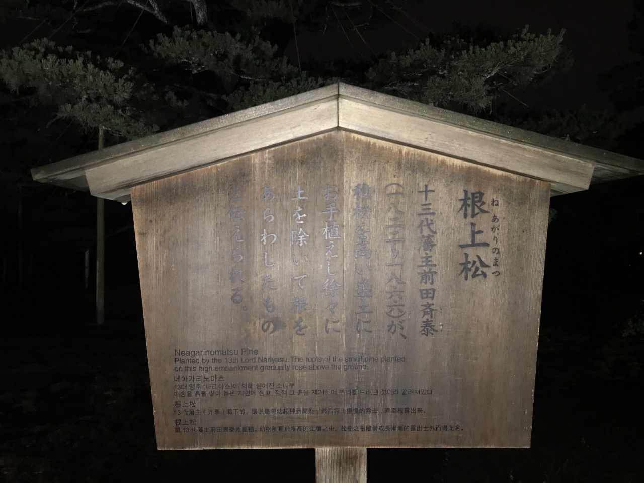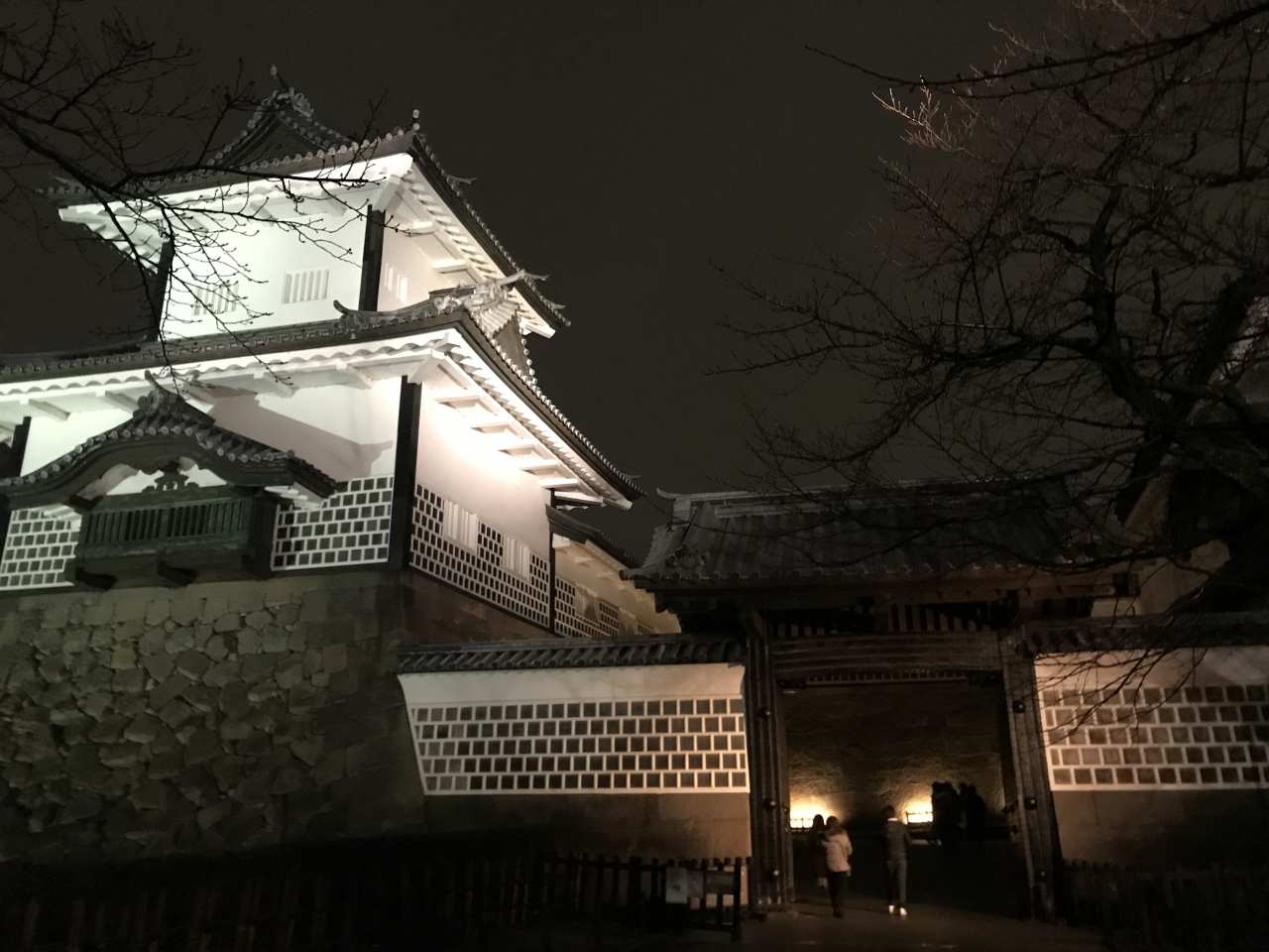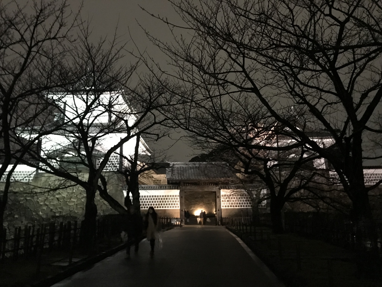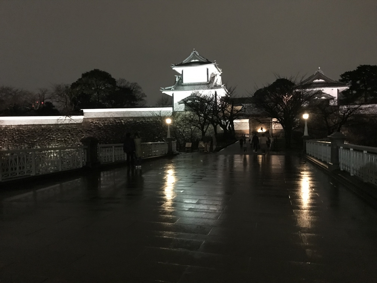大手門口から入って石川橋まであるった。石川橋を渡って兼六園まで行きました。雨が降ったりやんだりしてて、石川橋はすべりやすい状態。夜だったので、結構暗い。緩やかな坂になっているので、明るければ写真映えしそうな橋です。アイフォンでは暗すぎてなかなか撮りづらい。