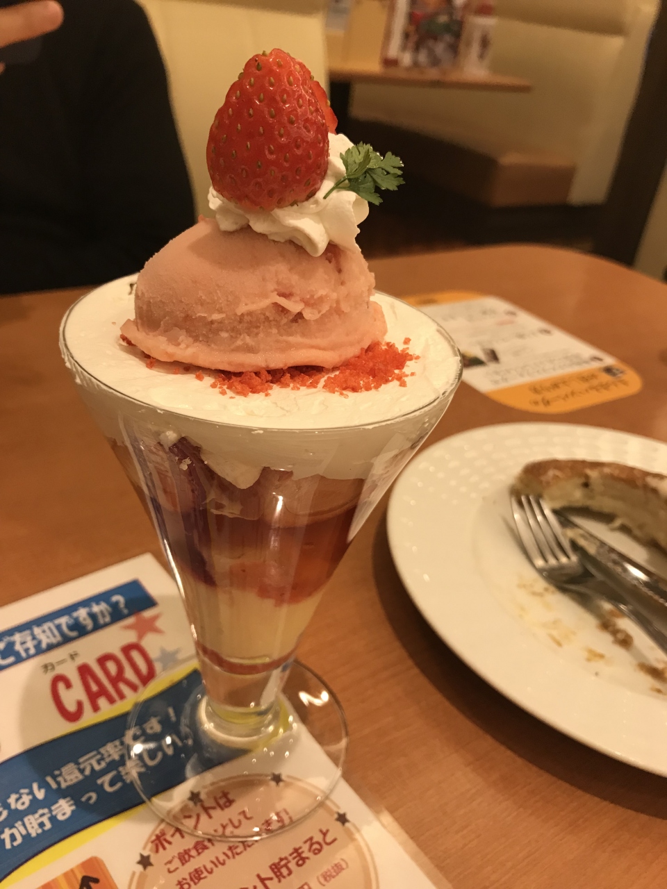 ちょっとだけ食べようと訪問。苺パフェと一押しのシチューポットパンを頼んでみたけど、想定外のまずさに食べきれなかった。ポットパン、マーガリン臭すぎ。苺のゼりーも色つけて寒天使っただけのような。。今度からココスじゃなくサイゼを選びます。