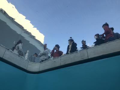 以前、夏のライトアップ期間に来たことがあったけど、その時は緑を基調としたライトアップで、今回、冬のライトアップはオレンジを基調としたライトアップだった。個人的にはオレンジのライトアップの方が綺麗だと思った。ライトアップの明かりはやっぱり少な目だけど、無料で開放しているのが嬉しい。2月なので寒かったけど、雪は全然積もってなかった。