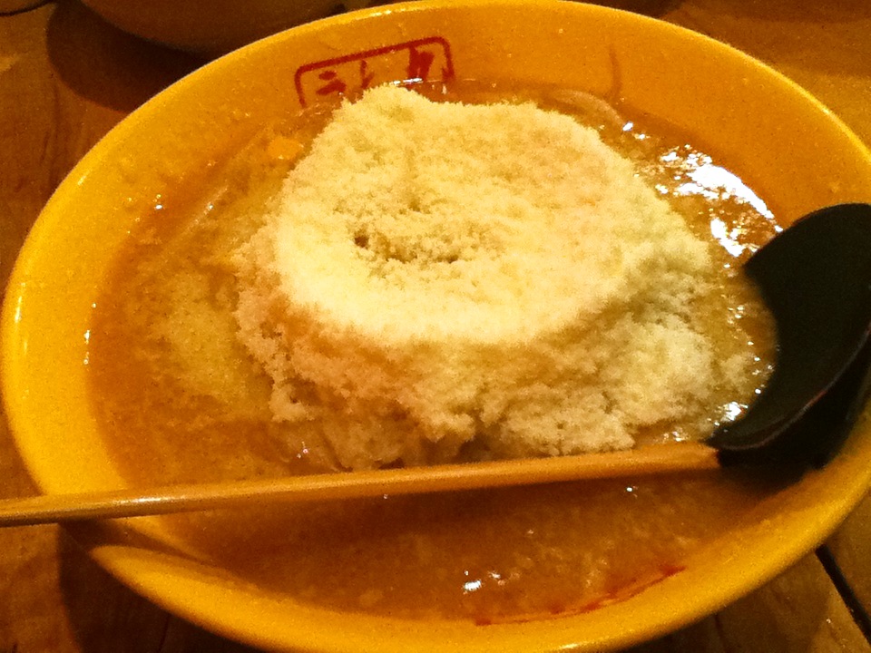 テレビで紹介されていて、会社の先輩に付き合ってもらって訪問。ゴルゴンゾーラの粉チーズが山盛りに乗った味噌ラーメンを注文。見た目のインパクトが強い。
