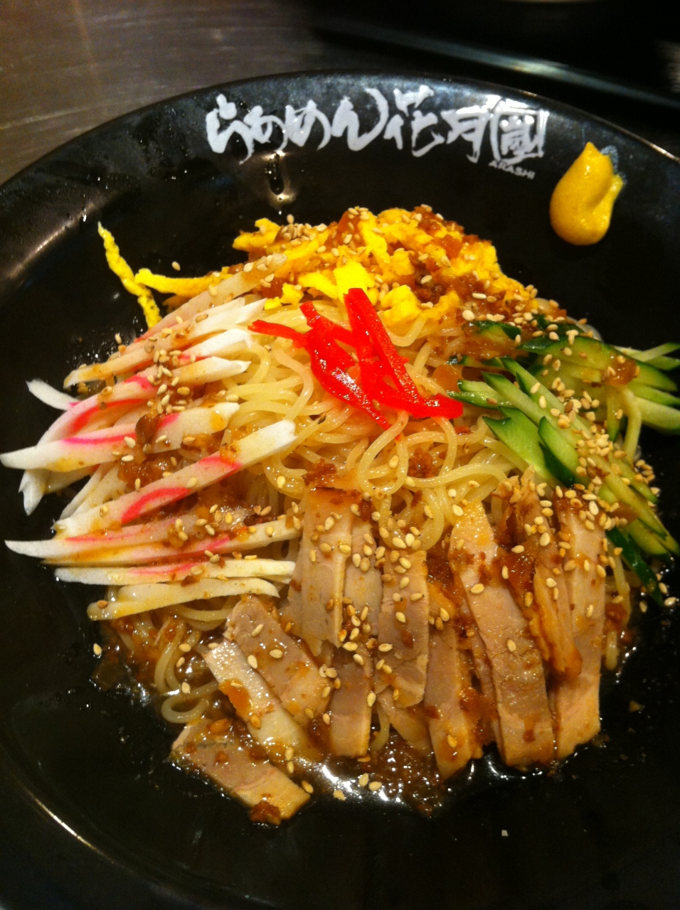 暑かったので冷しらーめんを注文。麺が多すぎだけど、酸っぱいタレが嬉しい。具材はきゅうり、なると、錦糸たまご、チャーシューなど。麺が圧倒的に多い。もっと野菜を乗せてほしい。一緒に入った人がとんこつラーメンを頼んでたけど、なんか市販のラーメンみたいだった。