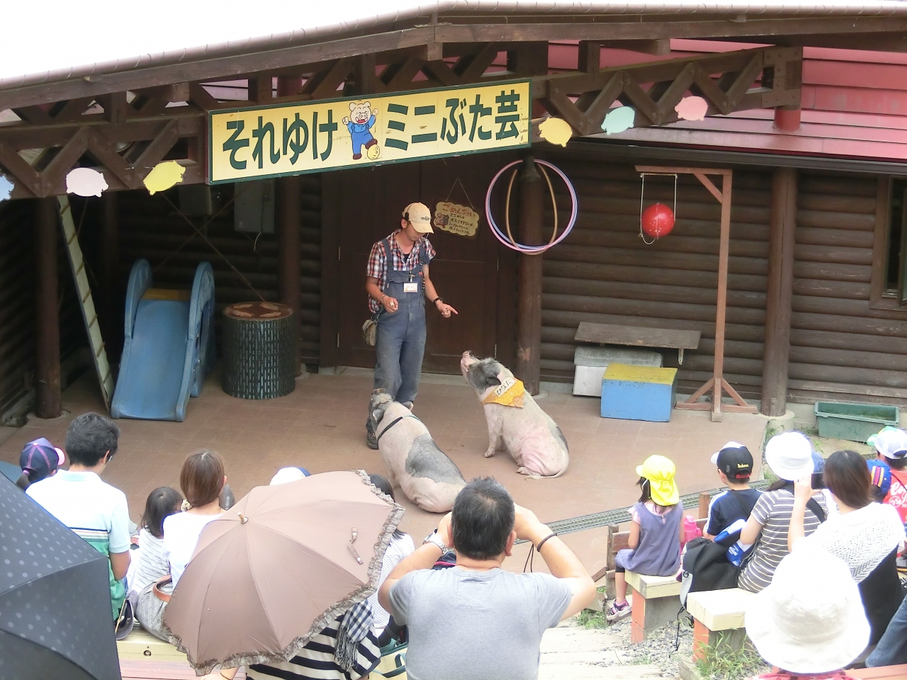 入場してすぐ、ミニぶの芸が行われていたので見学した。玉乗りやお座りなど結構賢いことがわかる。別コーナーで牛の乳しぼりを体験。無料で1回だけギュッと絞らせてくれる。乳搾りの部屋は展示室のようにもなっていて、豚の部位がどんなソーセージになるか詳しく解説されている。そのあと、豚小屋に行って丸々太った豚を見た。この寝てる豚もミニだったころは芸してのかと思うと感慨深くなった。