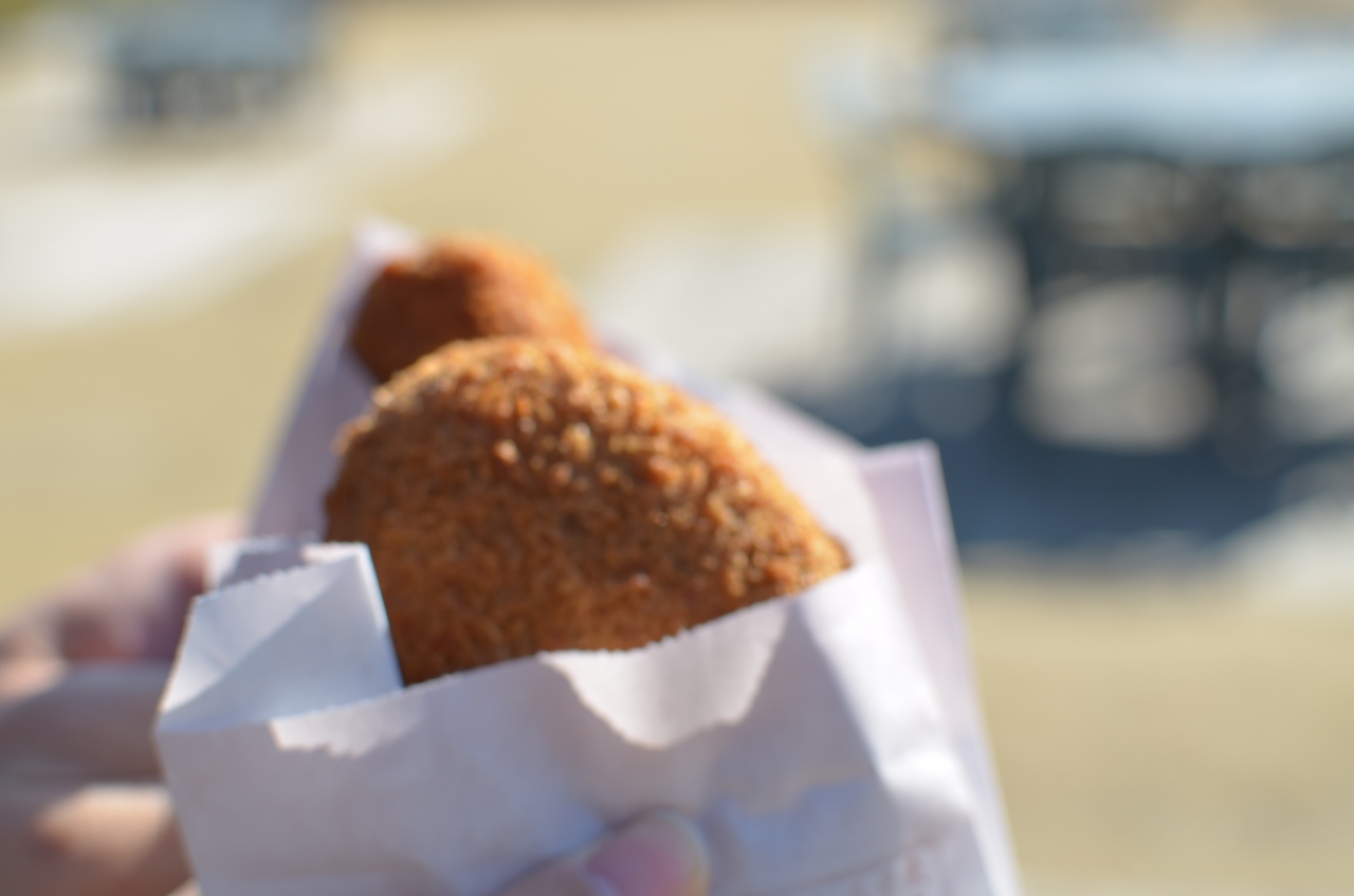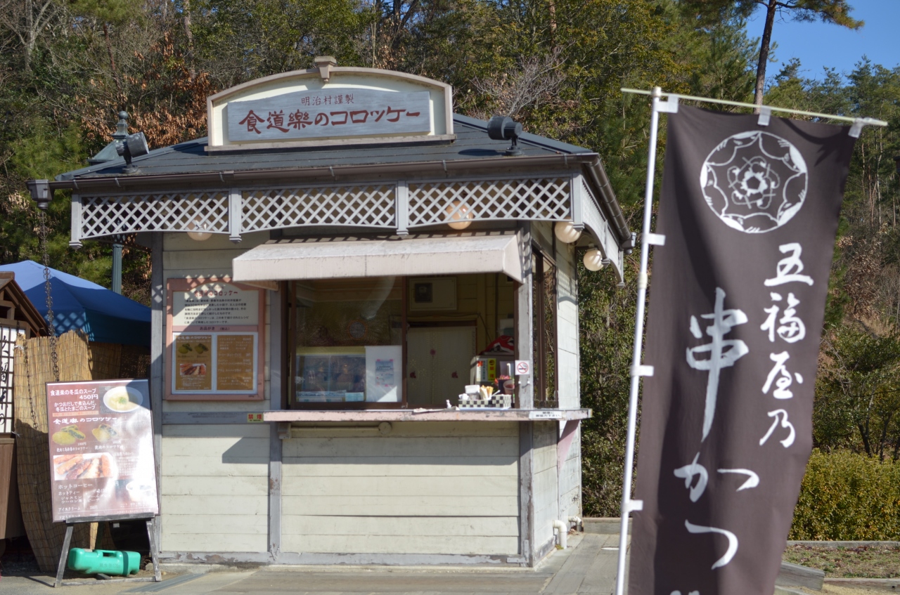 1月の明治村を訪問したので、寒かった。寒い中、コロッケの販売店をみつけたのでつい買ってしまった。メニューは2種類あって、ひき肉コロッケと、ひき肉と馬鈴薯コロッケの2種。どちらも180円。1つずつ買って食べた。タイミングが良かったのか、意外とアツアツのコロッケですごい美味しく感じてしまった。食べる環境って大事かも。