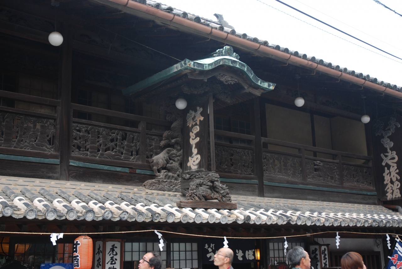 歴史がある神社なので、伊勢の参道見たいのを想像してたけど、参道の建物自体はそんなに古くないんですね。もちろん木造の古い建物は残っていたけど、少ないから目を引いた。うどんの本家とらやという店の前を通ったけど、素晴らしい建物でした。