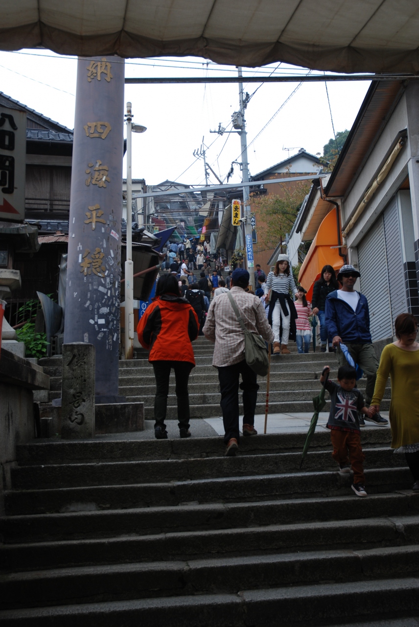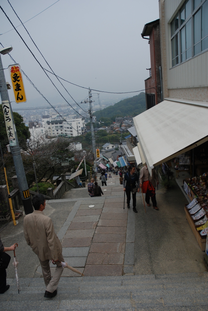 左側の部分に四海平穏と書かれた鳥居。長い階段の始まりで、このあたりから簡易籠が目立つようになってくる。簡易籠は面白いけど、ちょっと恥ずかしくて乗る気にならない。鳥居は石でできてるみたいだけど、みなさんべたべたとお札張ってますね。ちょっと汚れてるなあという印象。