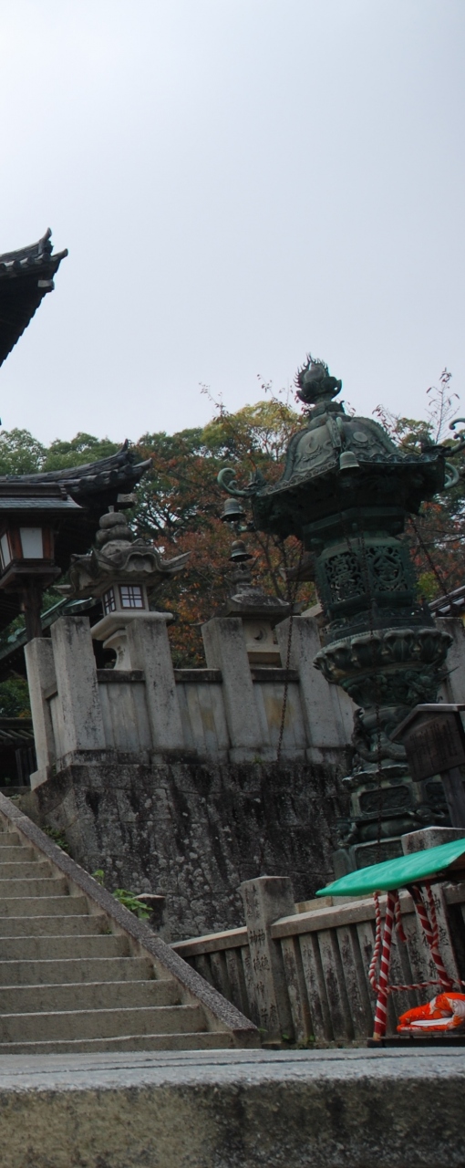 正面から大門を見て右手側にある大燈籠。とても大きく立派で歴史を感じられるくらい古そう。燈籠の上のデザインが御神輿のようになっていて面白い。よくよく見ると、金毘羅の金の模様まで入ってる。こんぴらさんの為のかなり凝っている大燈籠です。