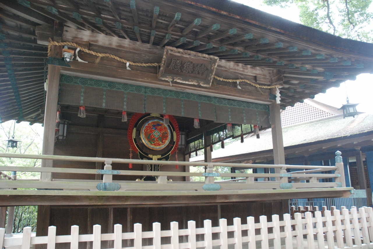 本殿を参拝するために長い階段を登り終えると、階段を登り終えた左手側に神楽殿がありました。神楽殿の中央には立派な楽太鼓が1つ置かれていて目を引きます。神楽殿は古そうで立派。実際に奉納の舞をしているところを見てみたいです。