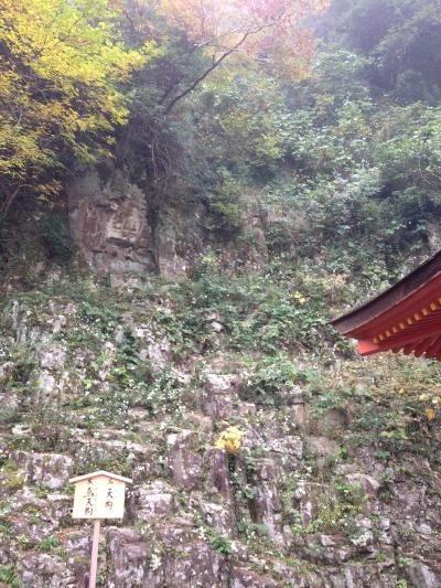 奥社にお参りしようと周りの風景を撮影してると、威徳巌に遭遇しました。切り立った岩山の上部に烏天狗と天狗の彫刻が施されています。肉眼では良く見えないけど、ズームで撮影すると良くわかる。岩山は木々で覆われていますが、11月初めでは多少色づいたところという感じ。紅葉の時期ならもっときれいだったと思う。