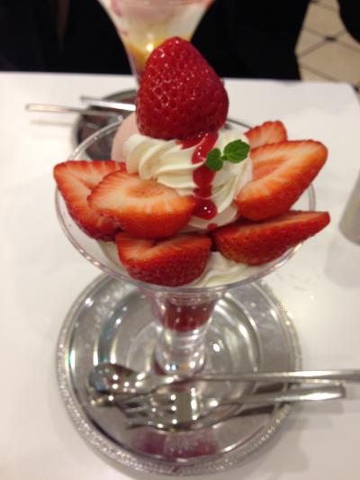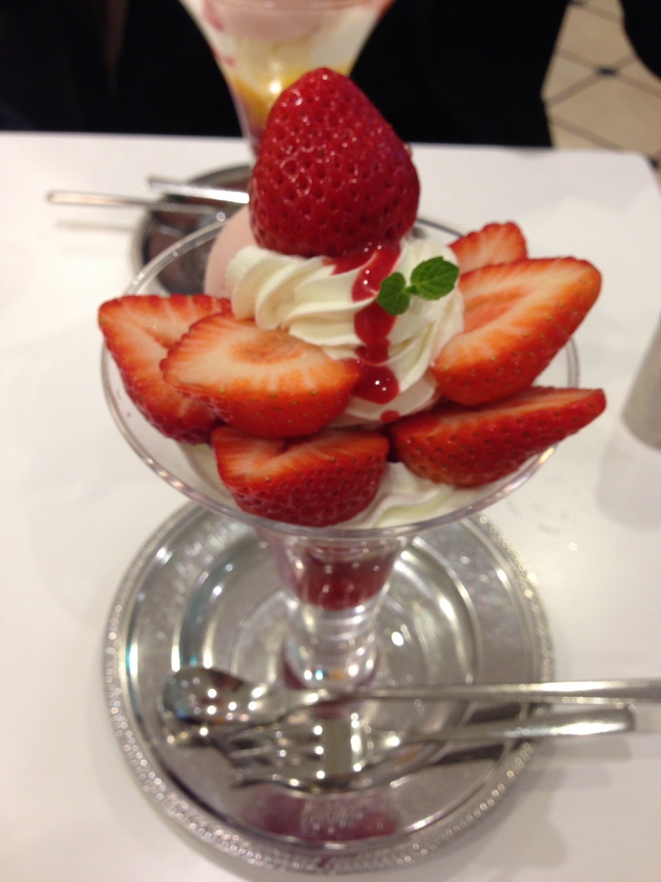 休日の昼下がりに訪問。大行列で1時間くらい待った。やっと席についてイチゴパフェを注文。思ったより小さめ?イチゴはたっぷりのっているけど、わざわざ半分に切ってある。見栄えはいいけど。ちょっと残念。ちゃんと味の違うアイスが乗ってて、イチゴのソースが美味しかったのは良かった。