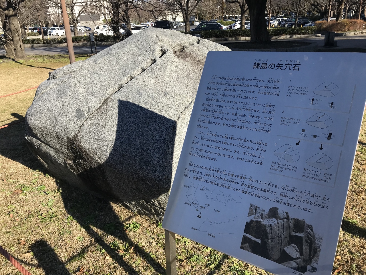 巨大な矢穴石ですが、均一に穴が開いています。これは石を切り取るために開けられた穴です。名古屋城の石垣にも多くの矢穴が残っているそうです。この後すぐ、名古屋城に行きましたが、矢穴は見つけられませんでした。