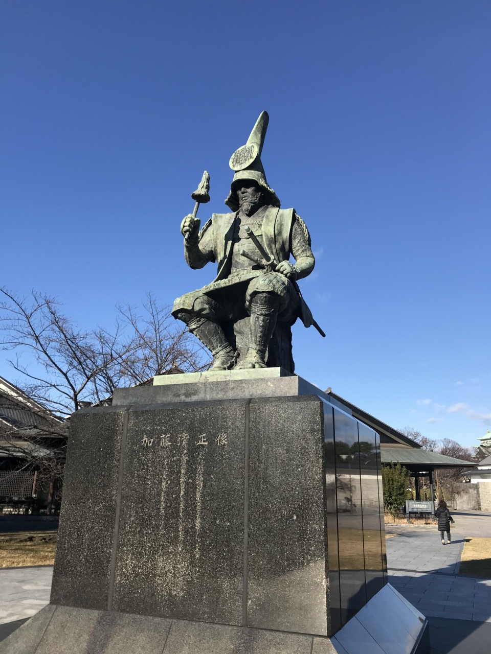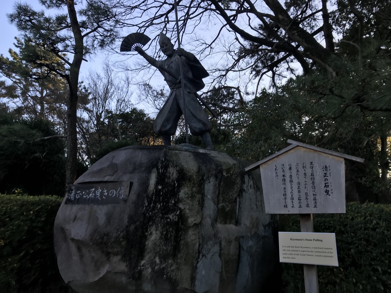帰り際に清正の石曳像を見ることができました。石の上で扇子を煽っている清正の像。躍動感があります。当時、名古屋城天守閣の石垣を割り当てられた清正は自ら巨石の上に乗り、人々を鼓舞したというから勇ましいです。当時の雰囲気と清正の人柄が伝わってきます。