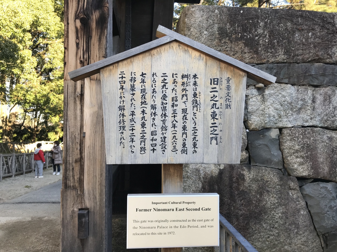 名古屋城はほとんどが再建された建物ですが、東二之門は古くから残る門で重要文化財に指定されていました。移築や修理などで何回か解体されています。門の形や石垣の配置など、独特で面白いと思いましたがあんまり見てる人はいませんでした。