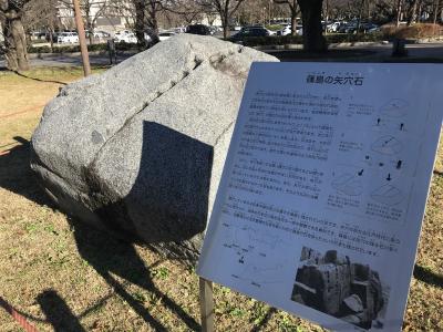 名古屋城に行く前に加藤清正像を見学。良く晴れた日で銅像の陰影がくっきりしていて雰囲気がありました。差配しているかのような姿で、凛々しい造形です。いろんな角度から眺めましたが、斜めからの姿が格好良いと思います。加藤清正像の近くには矢穴石という巨大な岩があります。