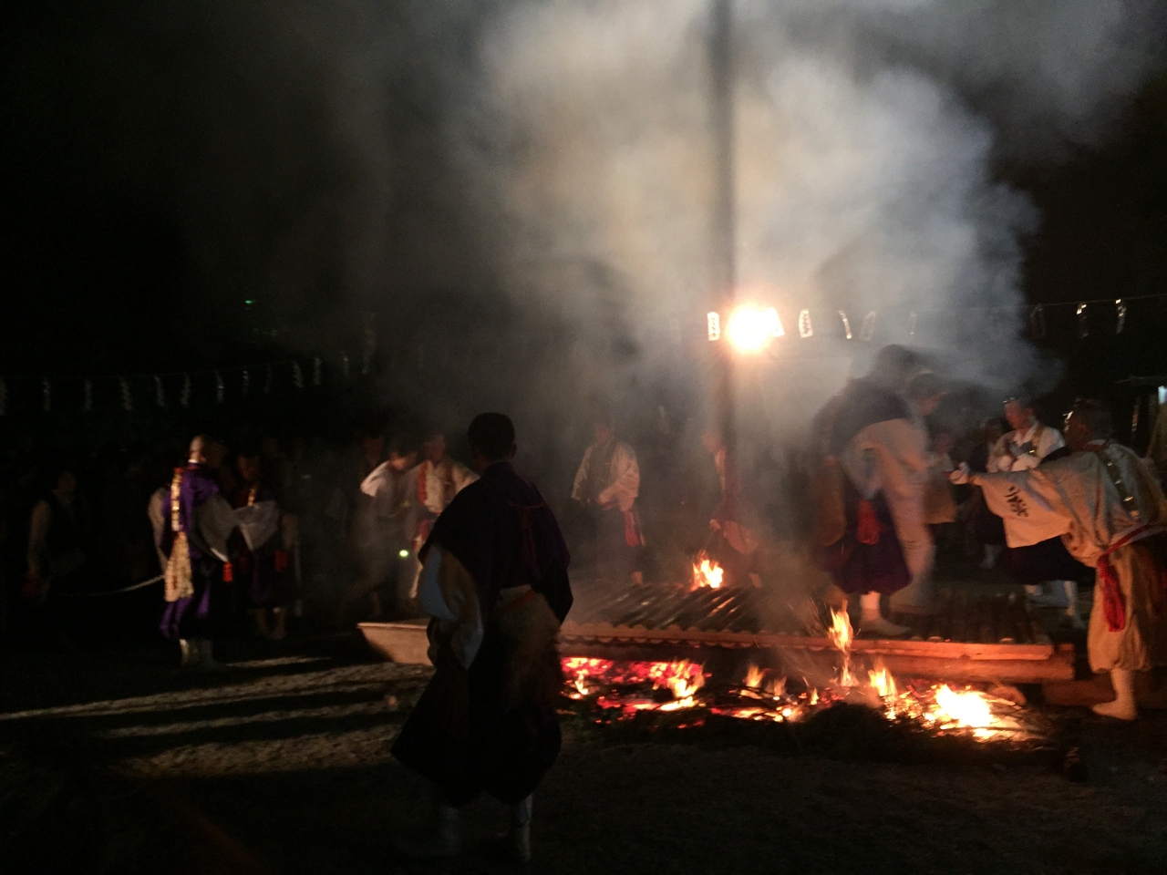 10月半ば、たまたま洞川温泉に泊まりに来て、夜、宿周辺を散策したら龍泉寺に通りかかり、八大龍王大祭というのが行われていました。たき火の上をあるっていて暑そうでした。皆、修験道の服を着ていて、独特な雰囲気でした。龍泉寺の門前にある鬼の像がカッコ良いです。