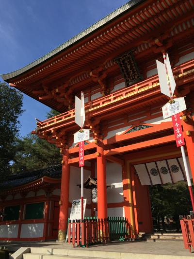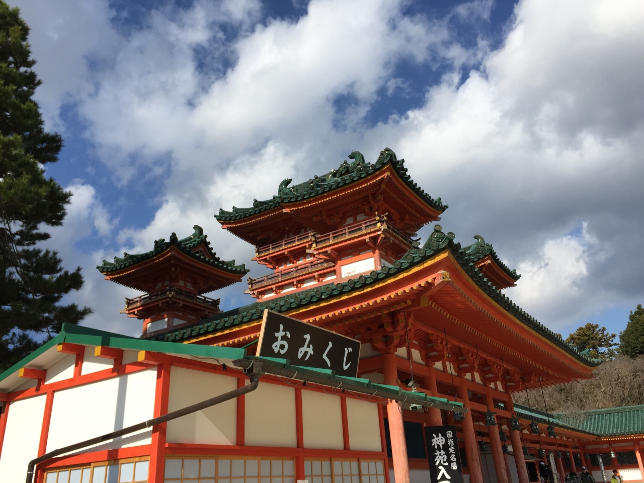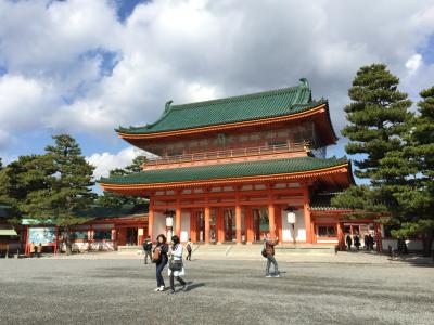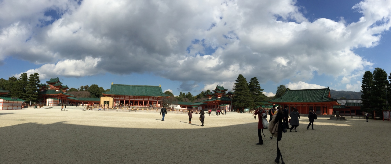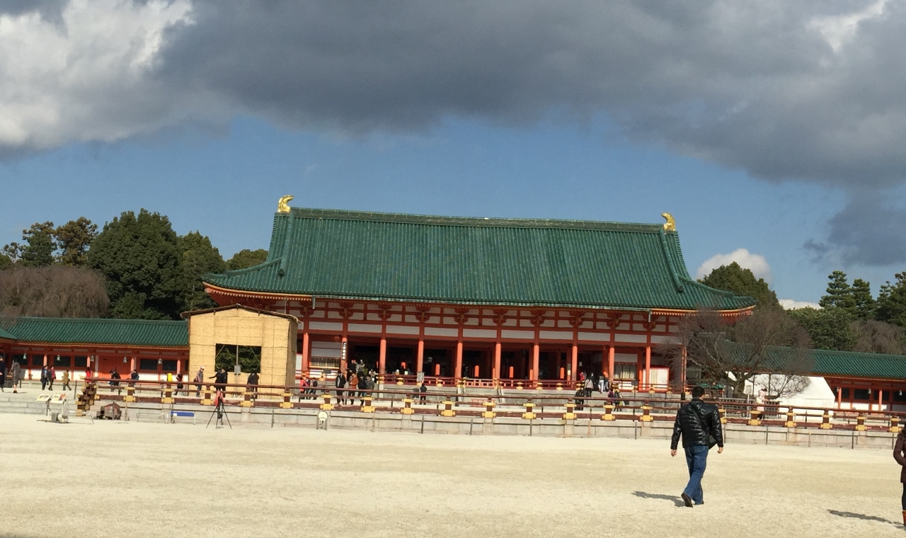 12月の晴れた日にお参りしました。近くのラヴァチュールから平安神宮まであるきました。おおおきな鳥居をくぐると、朱色と青磁色の独特な応天門が見えてきます。門をくぐると平安神宮が渡り廊下で四角く囲まれているのがわかります。門の正面にある拝殿へ向かい、お詣りして帰りました。ここは砂利などひいてなく、砂地なので歩きやすいのが助かります。