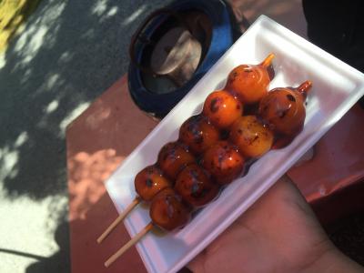 三千院にお参りに来て、お詣り前に誘惑に駆られてみたらし団子を食べました。お店の前にベンチがあって、座って食べることができます。みたらし団子の味は普通だけど、天気の良い日だったので、美味しく感じました。気候って大事だと思います。