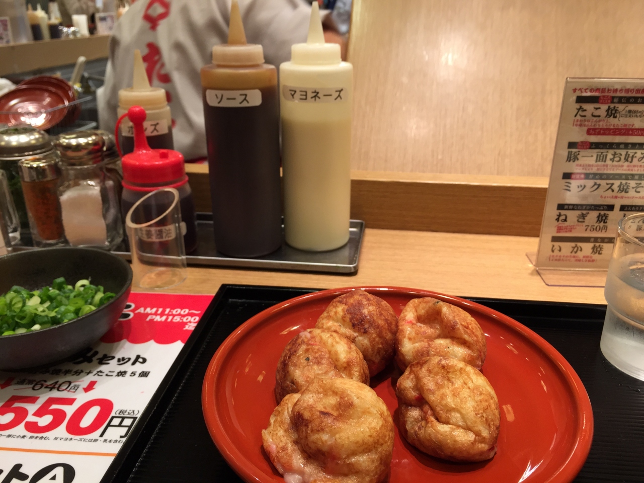 梅田駅周辺でたこ焼きめぐりをしようと、最初にはなだこに行ってから2件目でこちらのお店を訪問。カウンター席なので、一人でも入りやすい。1つ1つが大き目のたこ焼きで、ソースやネギなどはセルフで×タイプ。美味しかったけど、はなだこの方が好き。