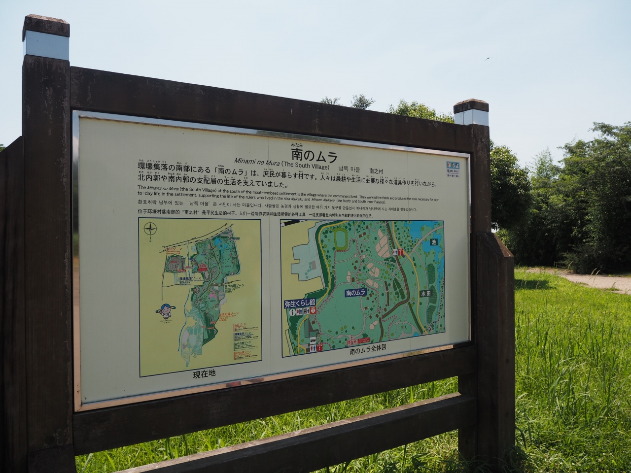 吉野ヶ里遺跡南部にある南のムラは支配者層の暮らしを支える一般庶民が暮らしていたところ。一般的な集落と、集落をまとめていたムラ長の家などがある。庶民の家とムラ長の家の違いがわからないけど、なんとなくムラ長の家のが大きく固まっている感じがする。家の中の見学もできるけど、結構せまい。ほとんどの家が同じように見えて、違いを感じるのが難しい。