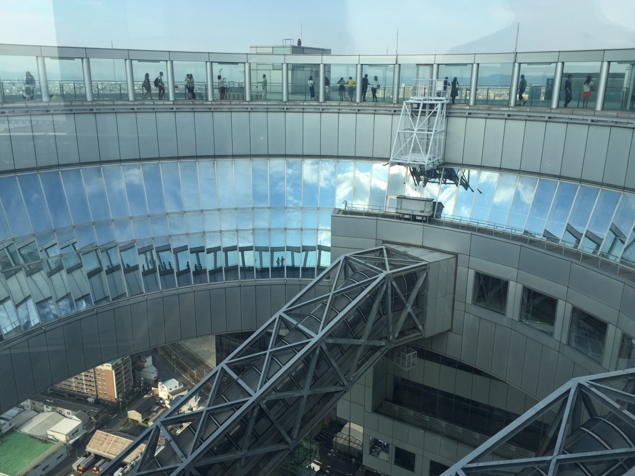 初めて梅田スカイビルに上りました。円形の展望台は、独特な形で近未来的。やや曇っていたのが残念だったけど、あんまり混雑していなくてゆっくり見学することができた。外に出て景色を眺められるので、風が気持ちよく、大阪のビル群が一望できたのが良かった。