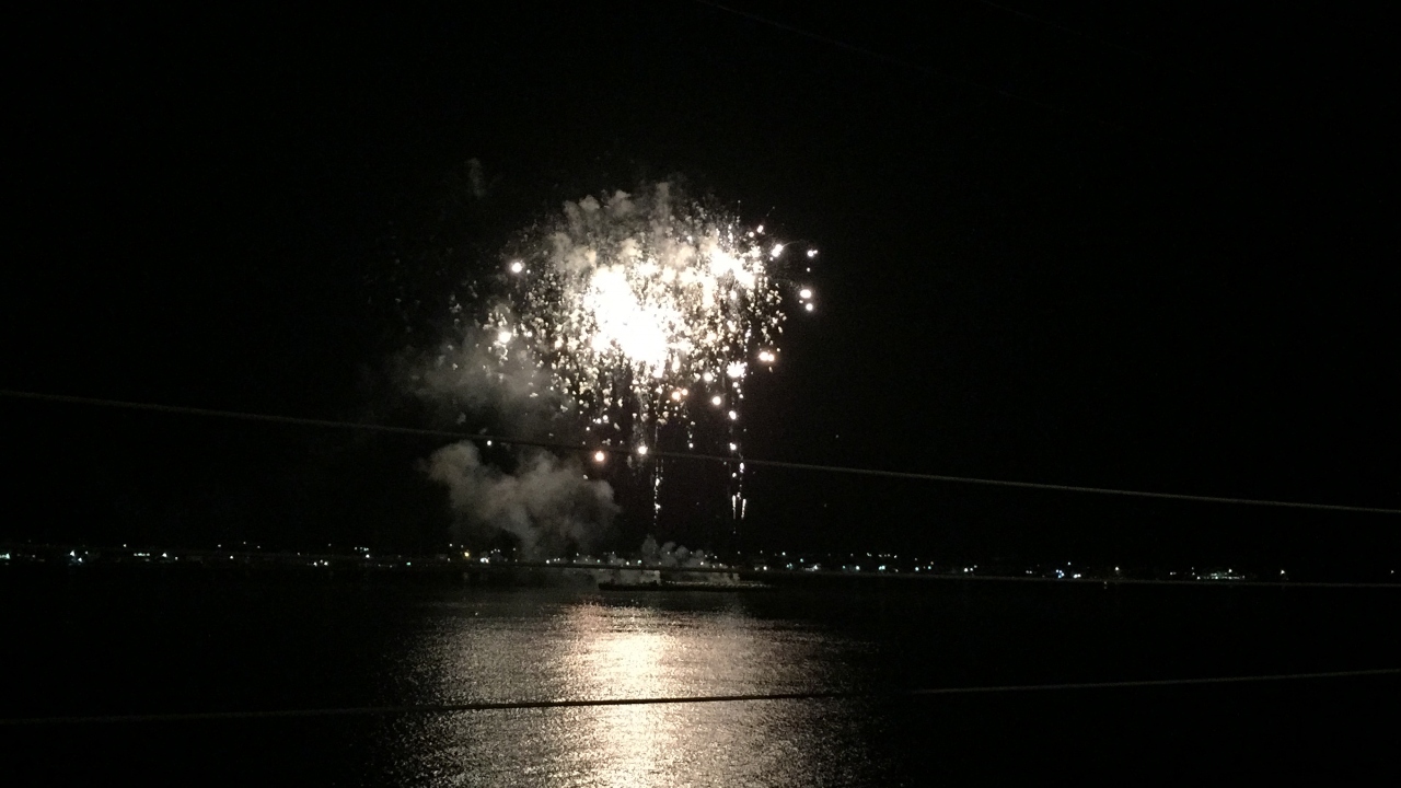 宿泊した民宿の屋上で花火大会を見学させてもらいました。花火は小さめで、1発1発の間隔が長すぎるときもあるけど、利根川に浮かんだ花火は綺麗でした。依然来た時は、もっと大きな花火が連発していたように思うけど、今回は最後だけ大きな花火でした。財政が厳しいというニュースと関係あるのかな?