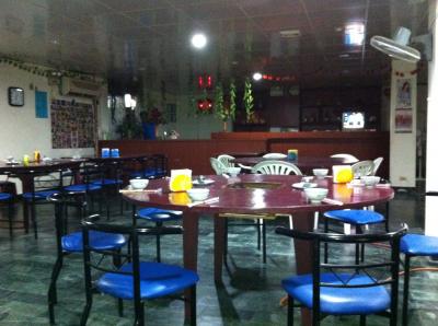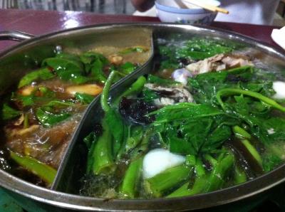 お肉、魚介、そして最後に空心菜が投入されて調理完了です。お鍋の赤いスー...