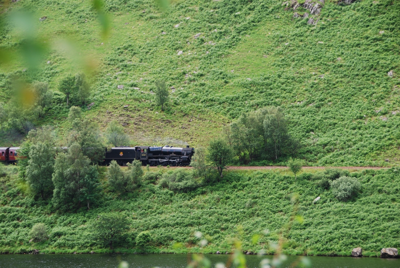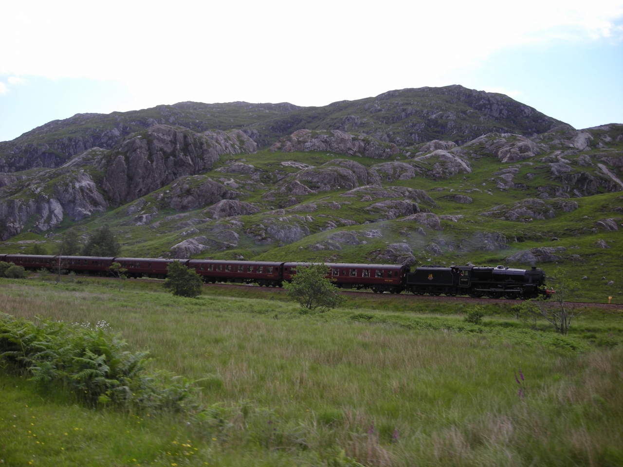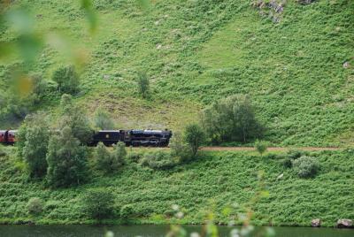 ジャコバイト号には乗りませんでしたが、レンタカーでグレンフィナンに行って、フォートウィリアム駅から出発したジャコバイト号がグレンフィナン高架橋を渡るのを見送ってから、マレイグに向かいました。途中、ジャコバイト号と何回か遭遇し、並走したりすることもありました。同じ景色を見たような気がして、とても楽しかったです。