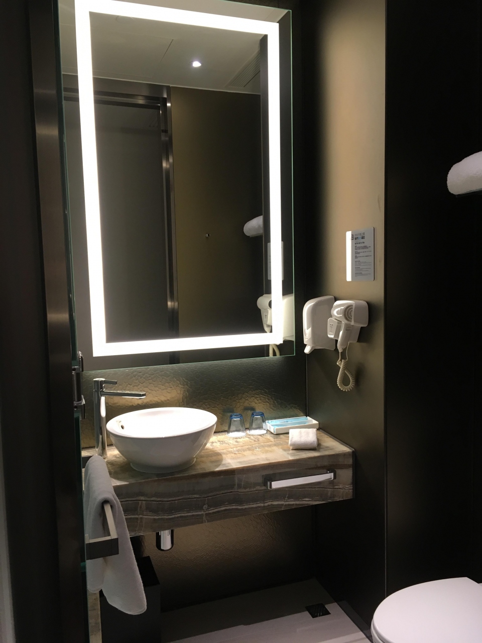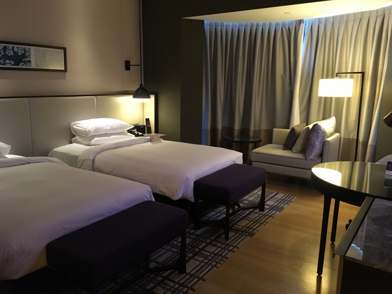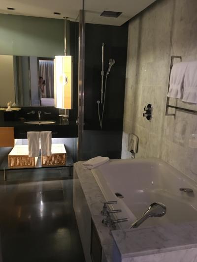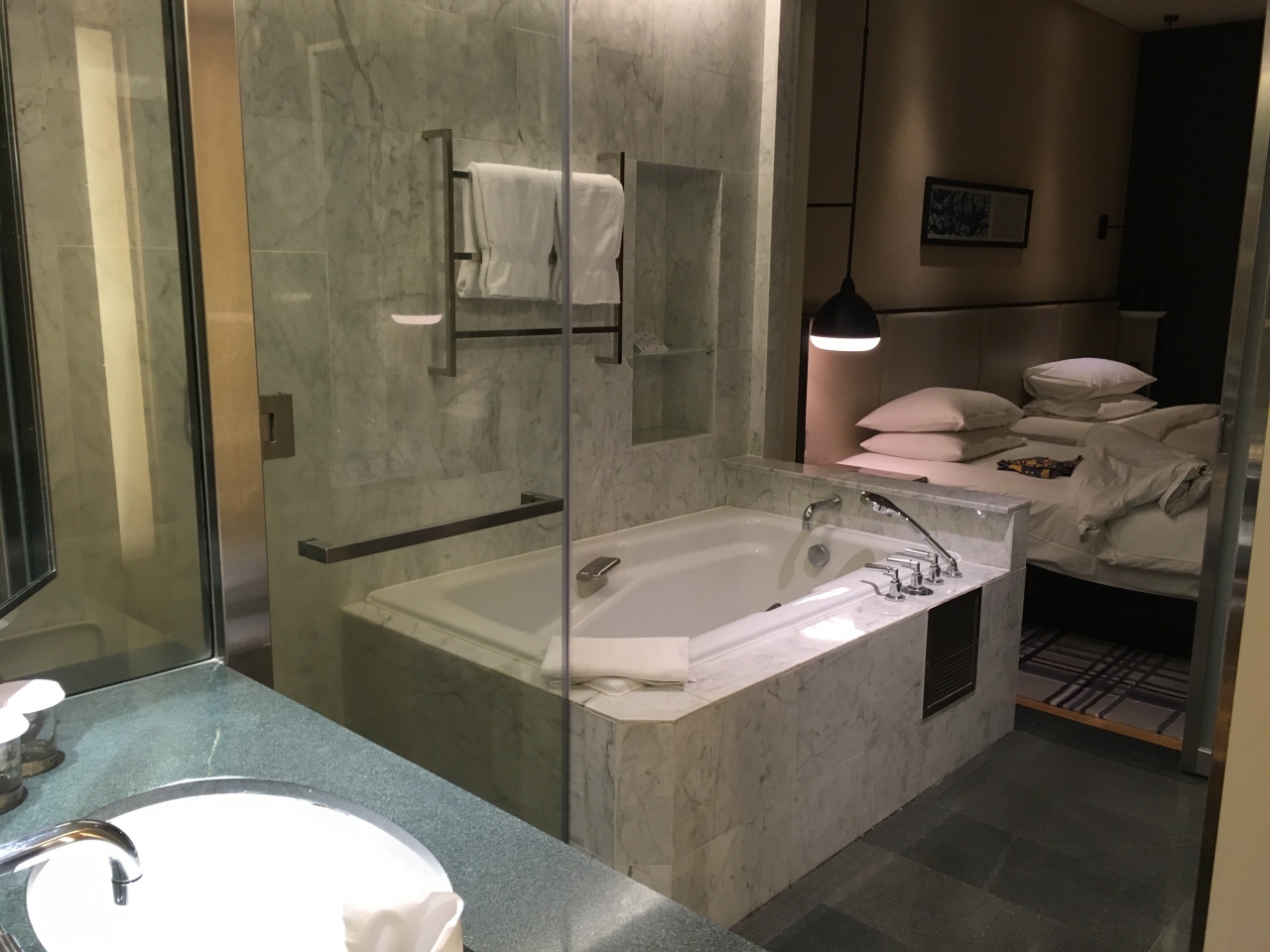 私が泊まったツインルームは、部屋とバスルームの間に壁がなくて、ガラス張りの引き戸で隔たっているだけなので、開けておくと、バスルームが部屋と一体となって、部屋全体が広く感じます。