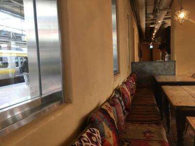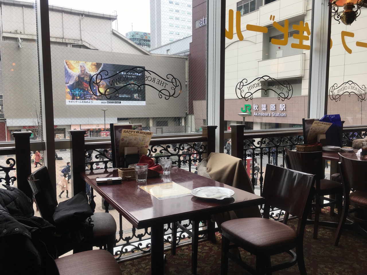 店内は広くて、窓からJR秋葉原駅とホームが見えます。分煙ですが、入り口に近い方が喫煙席なので、奥の禁煙席に行くのに、喫煙席を通らなければなりません。