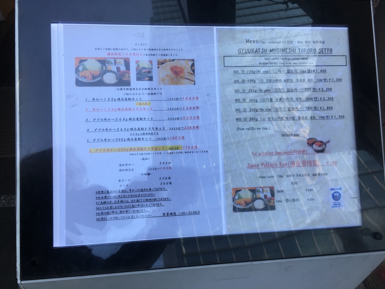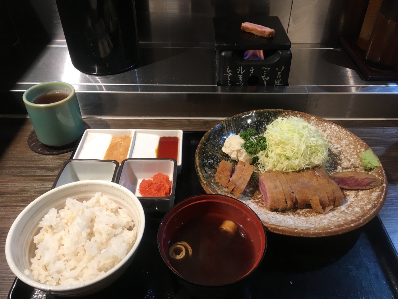 席に着いて見ると、卓上に1人用コンロが置いてあって、その上に石盤が乗っています。料理がわりと早く出てきました。店員さんが料理を出してから、コンロ中の固形燃料に火を点け、牛かつの断面をよく焼いてくださいと言いました。以前、別の牛かつ屋さんで食べた時、こんなことなかったので、少し違和感を覚えました。そのせいで、店内は煙たかったし、髪の毛やお洋服にも匂いがついてしまいました。